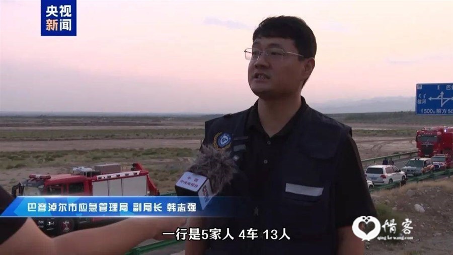 根据获救人员口述,其一行13人驾驶4辆车在乌拉特后旗乌盖苏木东乌盖沟下游露营时,突发山洪将人员和车辆冲走。这13名遇险者来自5个家庭,其中男性8人、女性5人。