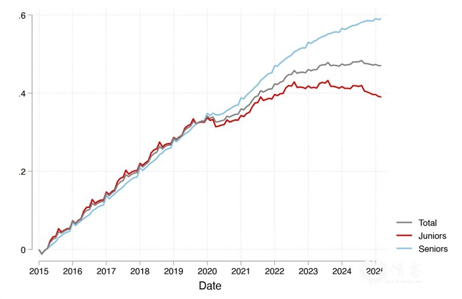 公司样本中初级工人和高级工人随时间变化的平均数量,图源自《生成式人工智能作为资历偏向的技术变革:基于美国简历与职位发布数据的实证研究》