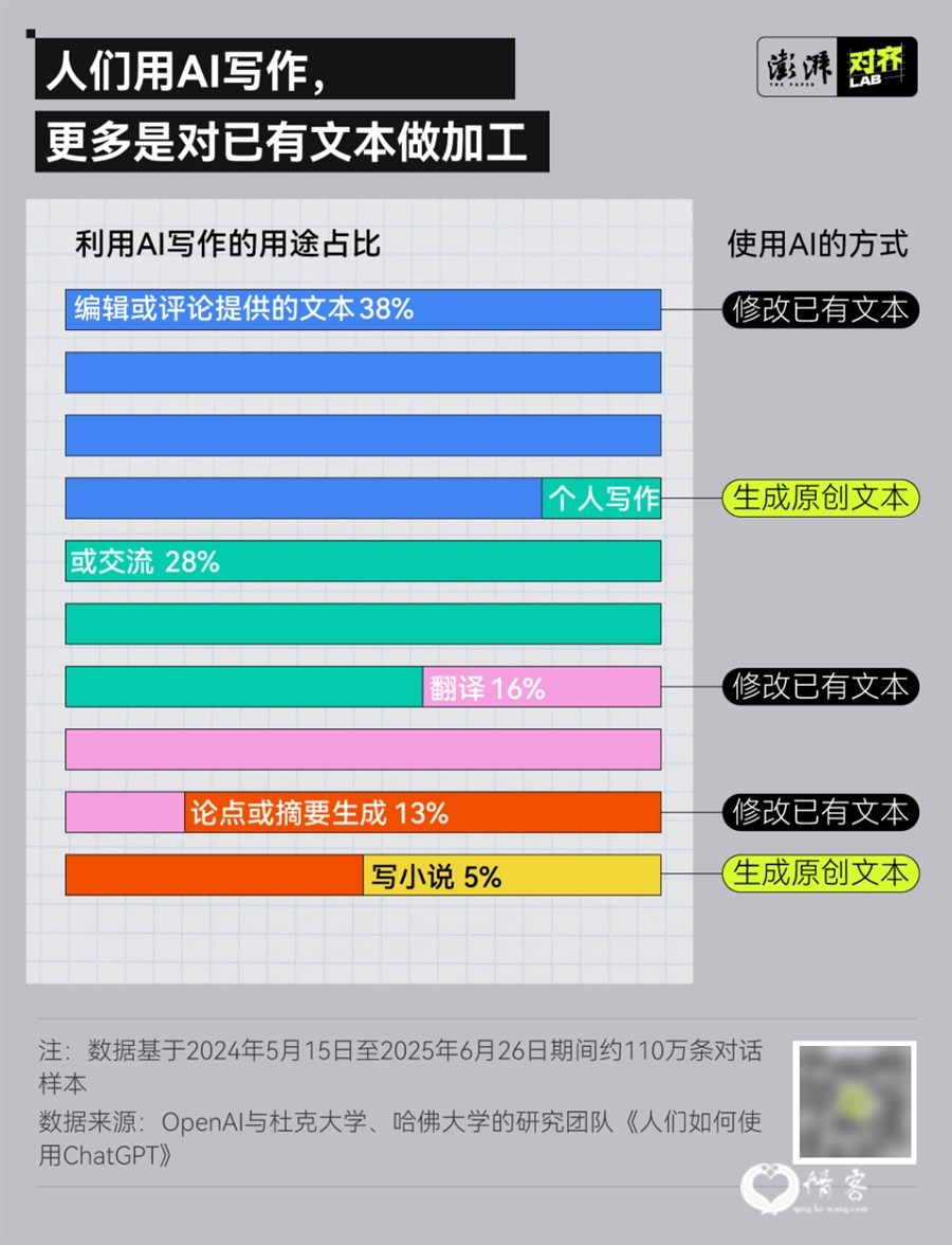 具体到最常用的写作任务,这背后用户的核心需求其实在于“文本加工”而非“从零生成”。数据指出,在所有写作对话里,约三分之二的需求是让AI编辑、润色、总结或翻译文本内容。