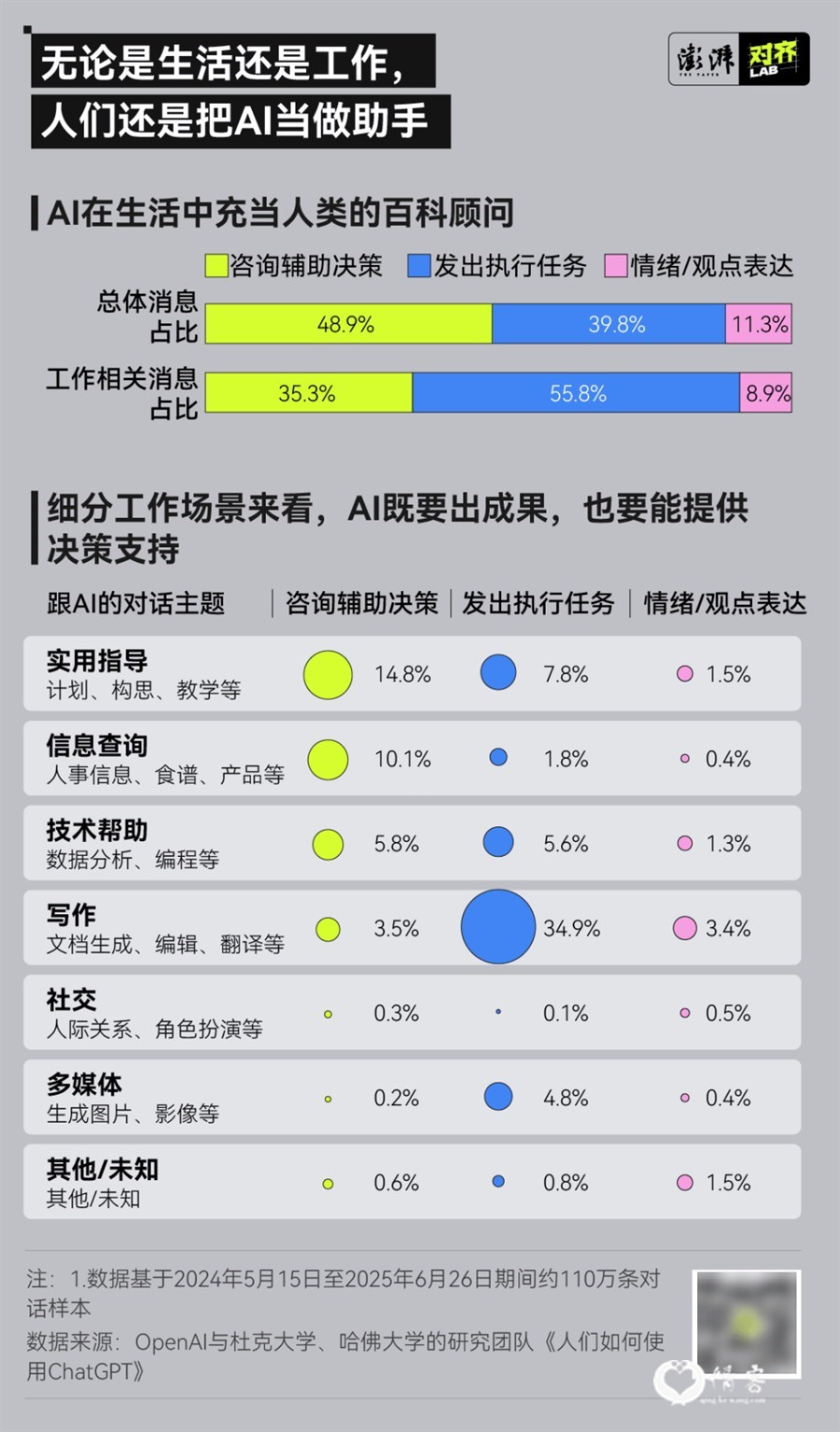 近日,OpenAI联合哈佛大学、杜克大学共同发布了长达63页、涵盖150万份对话数据的研究报告 《人们如何使用ChatGPT》。透过这份数据,我们能窥探出,现在人们用AI时,其实更愿意把它当成“百科顾问”。
