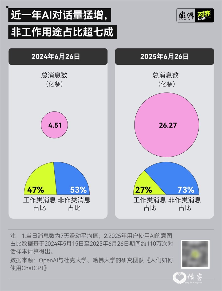 从整体对话量来看,过去一年大家对AI的使用需求呈爆发式增长。2025年6月26日,ChatGPT的消息量大约有26.27亿条,较去年同期翻了近6倍。