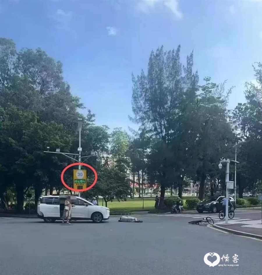 值得注意的是,就在9月29日上午10时许,华南理工大学的五山校区也发生了一起交通事故。现场图片显示,一辆白色SUV停在路边,有人背对车辆躺在地上,远处有一辆倒地的自行车。事故地点上方悬挂着限速30公里/小时的指示牌。