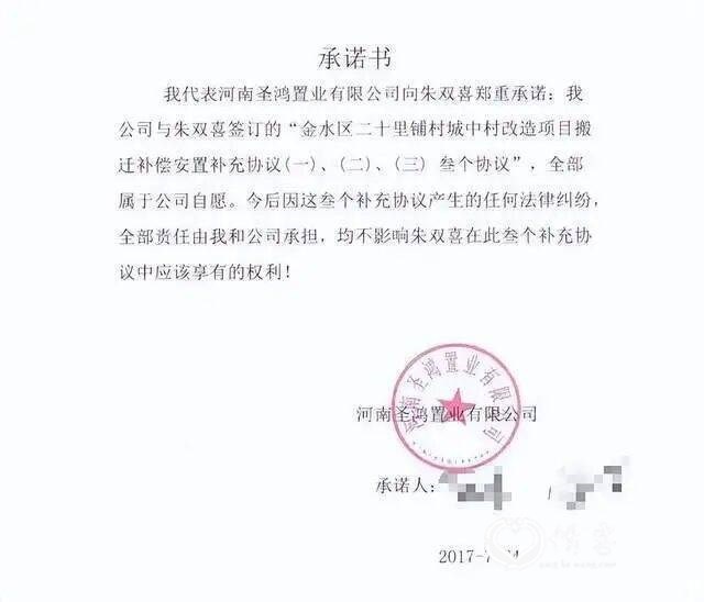 他告诉华商报大风新闻记者,2017年7月17日,开发商河南圣鸿置业有限公司(以下简称圣鸿公司)工作人员来到他家里,在当地政府工作人员见证下,他们签订了《搬迁补偿安置补充协议》。