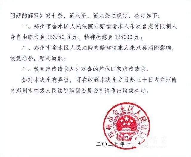 10月9日,郑州市金水区法院出具《国家赔偿决定书》,决定由该法院向朱双喜支付限制人身自由赔偿金约25.68万元、精神抚慰金12.8万元,共计38万余元。同时决定由金水区法院向朱双喜消除影响,恢复名誉,赔礼道歉,驳回他的其他诉求。