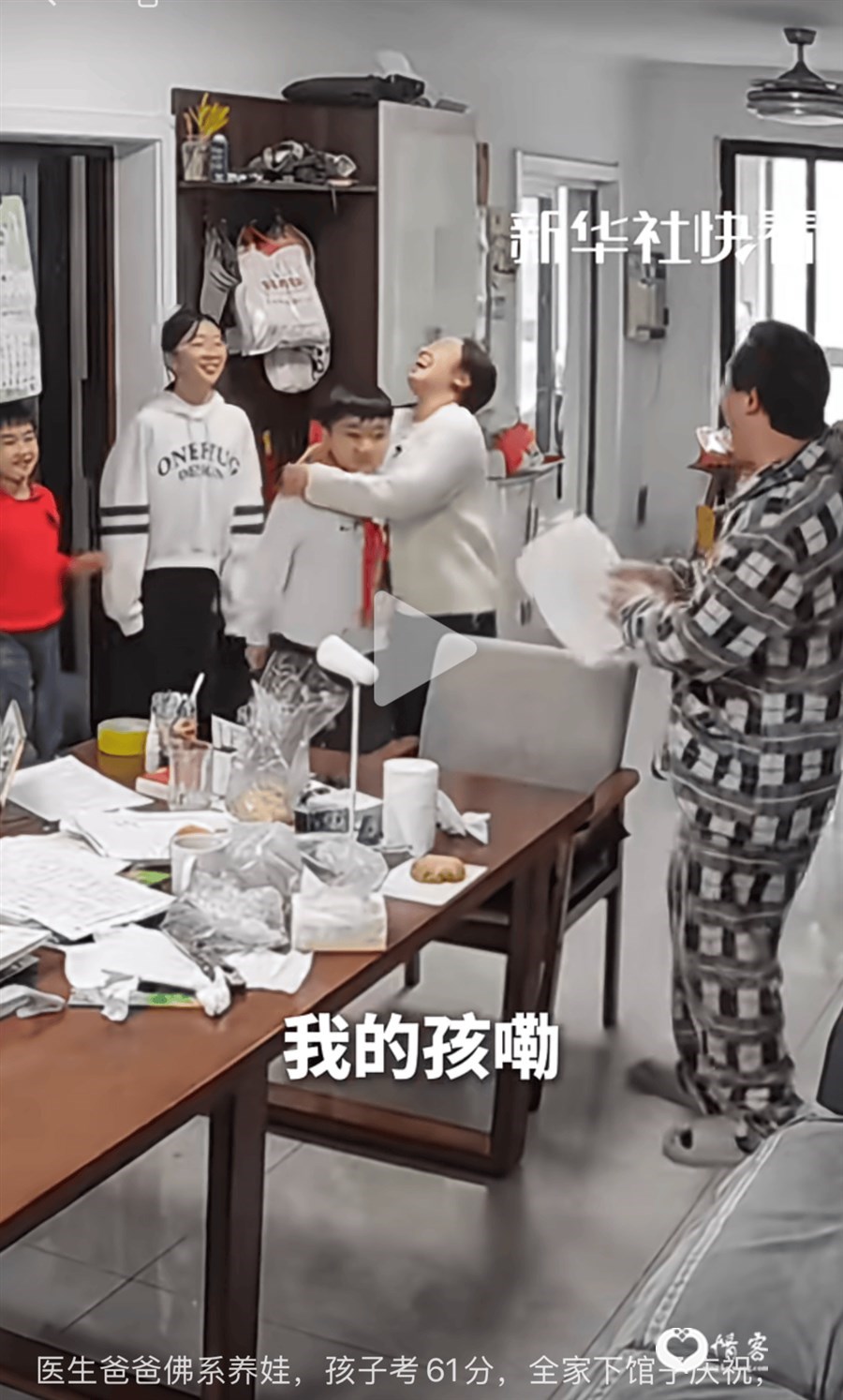 10月11日,“孩子考试进步考了61分全家欢呼”的视频在网上走红。视频中,孩子妈妈拿着试卷,和三个孩子走进家门,妈妈笑着告诉坐在沙发上的爸爸,“梁医生,你家祖坟冒青烟了,恁儿考了61分。”孩子爸爸高兴得站起来接过卷子,还说“赶紧告诉孩子爷爷奶奶,下馆子庆祝”。
