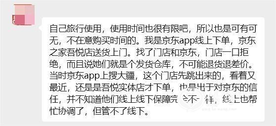 “门店一口拒绝,而且说她们就是个发货仓库,不可能退货退差价。”李露露表示,之后她又尝试通过京东线上平台协调,可得到的回复是线上管不了线下店。