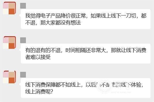“有的退有的不退,时间相隔还非常大,那就让线下消费者难以接受。”李露露坦言,电子产品降价本身是正常市场现象,如果线上线下能统一政策,大家或许不会有太多想法,但这种“同品不同权”的情况,让线下消费者感觉受到了不公平对待,“线下消费保障都不如线上,以后是不是直接线下体验,线上消费呢?”