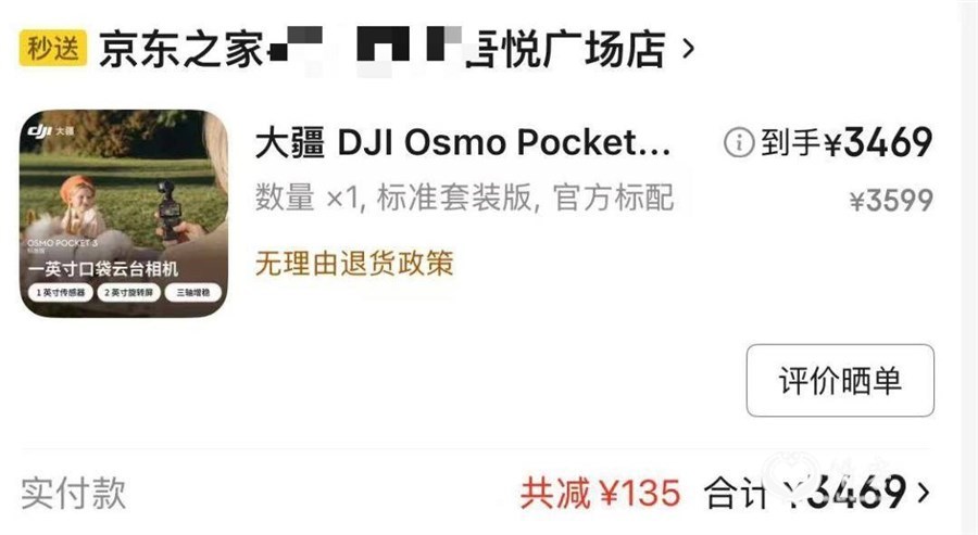 9月29日,她通过京东App下单了一部Osmo Pocket 3,实付价为3469元。据李露露介绍,该产品由京东之家吾悦店发货,其于10月2日完成产品激活。