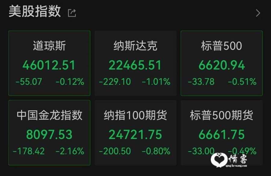 当地时间周二(10月14日),美股三大指数集体低开,截至发稿,道指跌0.12%,纳指跌超1%,标普500指数跌0.51%。