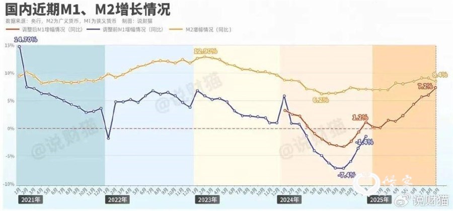 其实,M1增速从去年9月底以来,就不断陡峭走高,反而是M2增速出现"掉头"迹象。
