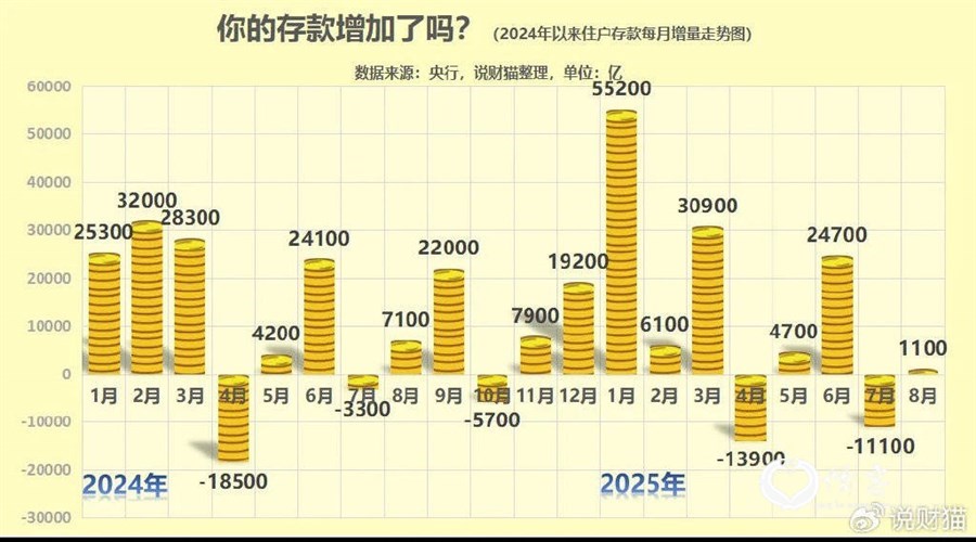 简单计算,今年9月,人民币存款整体增加2.21万亿,其中住户存款新增2.96万亿,非金融企业存款增加9194亿。