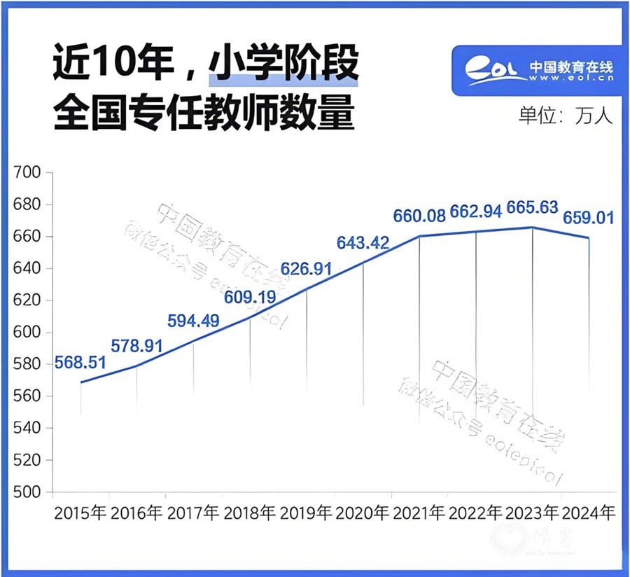 西南大学的研究显示:小学教师需求将在2024年触顶,随后开始净减少,未来10年内会有至少65万人“无课可上”。而初中则将在2026年达到教师峰值,高中是2030年,大学要到2035年。