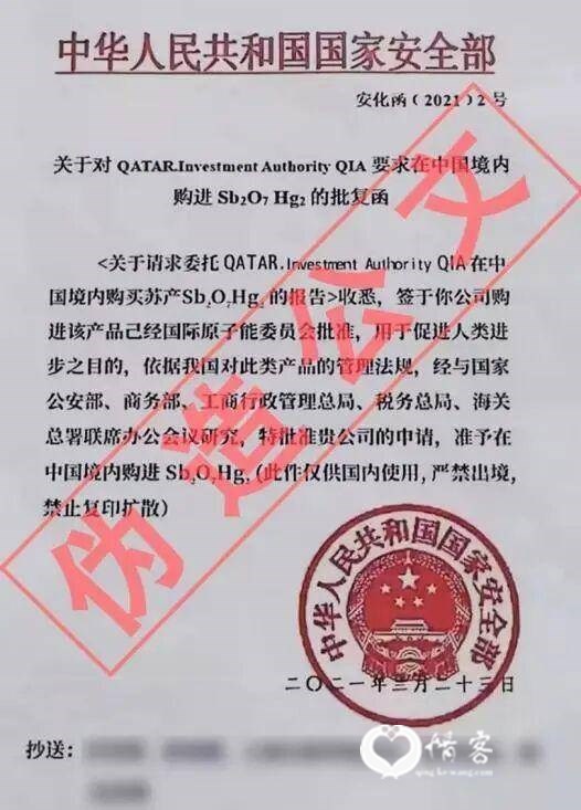 为增强骗局的可信度,不法分子假扮“将军”“领导”“书记”等官方身份人员,制造可获取“国家战略储备资源”的假象。不法分子还参照互联网上流传的政府公文“模板”,伪造国家安全部等机关单位红头文件,杜撰“国家安全部每年都会有类似文件审批‘红汞’交易”信息,谎称采购“红汞”活动已获授权,将经济诈骗活动包装为“官方授权的大宗国际贸易”,捏造“授权倒卖”叙事,骗取受害者信任。