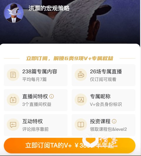 红星资本局注意到,洪灏在开通知识星球之前,已在微信公众号和微博两个平台开通付费社群。其中,微信公众号的大部分文章都需要付费才能阅读全文,微博则是开通了V+,价格为3888元/半年起。
