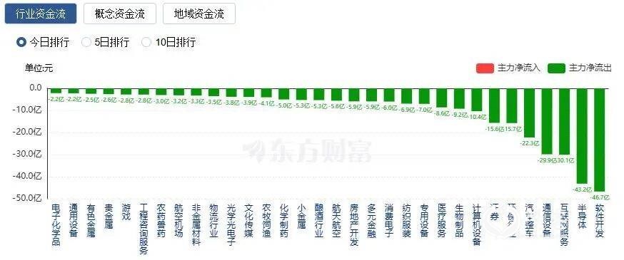 净流出方面,软件开发、半导体、互联网服务等净流出排名靠前,其中软件开发净流出46.75亿元。