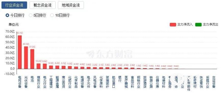 行业资金方面,截至收盘,电网设备、光伏设备、电池等净流入排名靠前,其中电网设备净流入63.10亿。