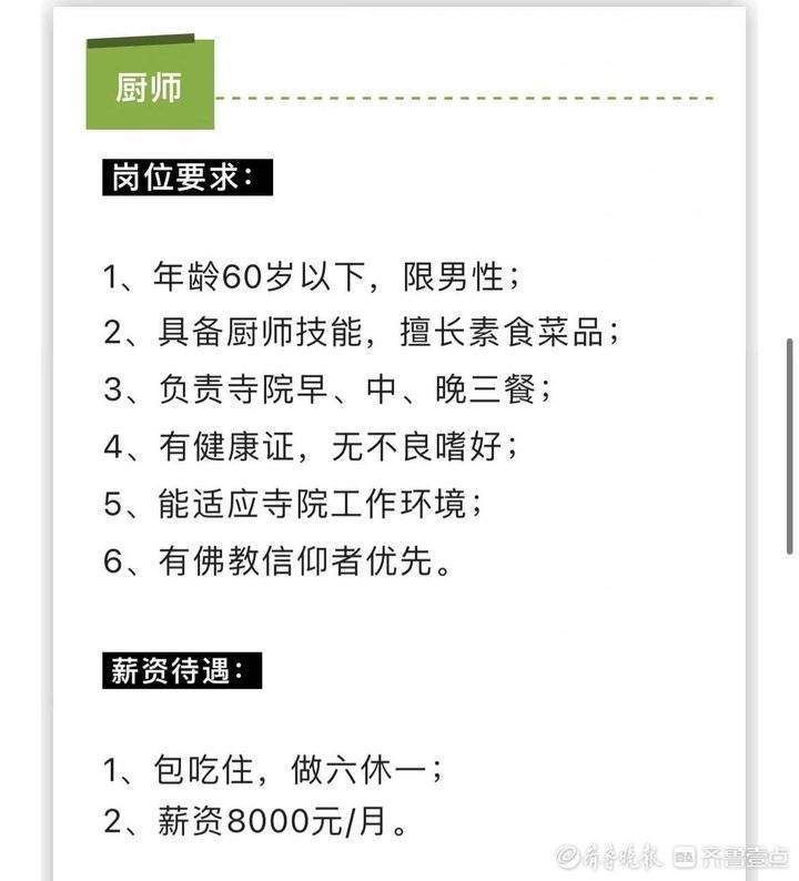 厨师要求60岁以下,限男性,负责寺院早、中、晚三餐,待遇包吃住,做六休一,薪资8000元/月。园林绿化维护员负责寺院草地、盆花、盆景、花圃的日常养护等,要求26-60岁,园林绿化施工、园林景观、园艺等相关专业毕业,入职薪资7000元/月,寺院提供食宿,周末双休。
