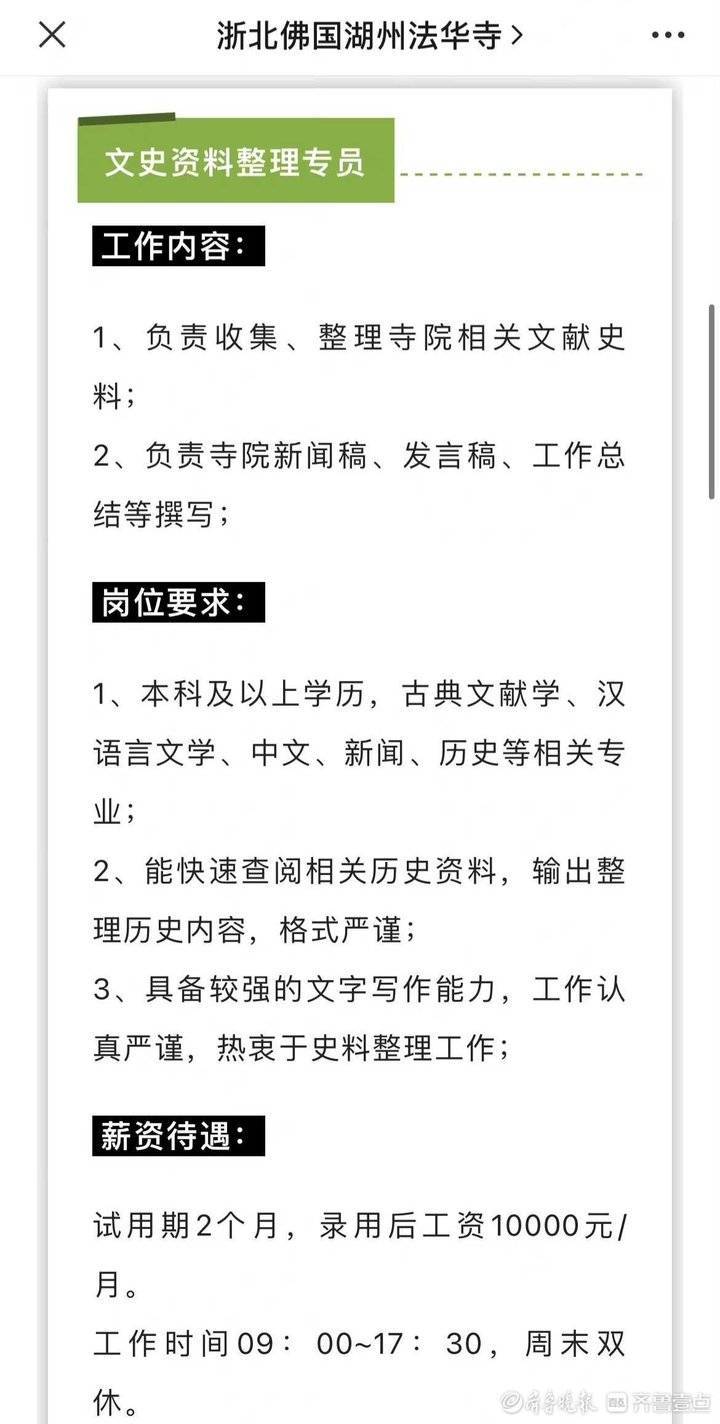 7月5日,一则岗位招聘的推文火了。推文来自浙江湖州白雀法华寺(下称“法华寺”)官方微信“浙北佛国湖州法华寺”,面向社会招聘文史资料整理专员、厨师和园林绿化维护员,招聘给出的薪酬待遇等让网友直呼心动。