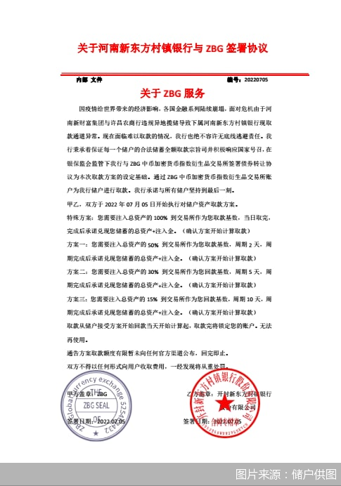 特殊兑付方案是什么?根据一位储户提供的信息,该文件名称为《关于河南新东方村镇银行与ZBG签署协议》,并且在文件末端加盖了疑似开封新东方村镇银行的公章。文件提到,“在银保监会监管下我行与ZBG中币加密货币指数衍生品交易所签署债券转让协议为本次取款方案的设定基础。通过ZBG中币加密货币指数衍生品交易所账户为我行储户进行取款” 。