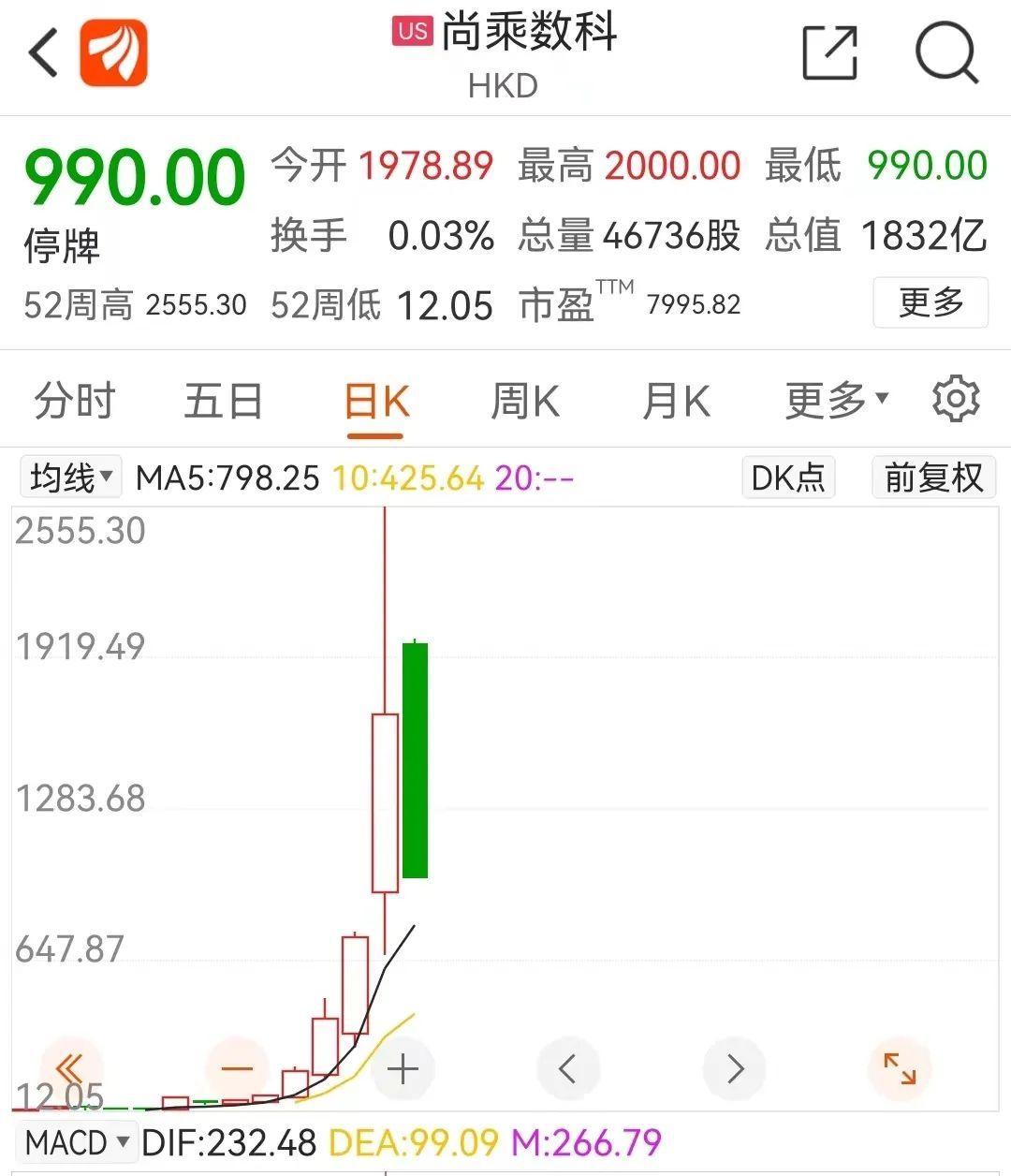 13天暴涨214倍的中概股尚乘数科突然暴跌41%触发熔断 市值一度大超阿里